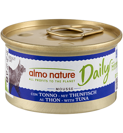Οι συνταγές των Daily Menu παρασκευάζονται με κόκκινο κρέας, άσπρο κρέας, ψάρι, αυγά, λαχανικά και ρύζι συστατικά κατάλληλα για κατοικίδια. Όλη η γκάμα των τροφών δεν περιέχει τεχνητά χρώματα ή συντηρητικά. Τα Daily Menu, μέσω της εγγύησης ποιότητας Almo Nature, διασφαλίζουν οτι προσφέρετε μια ολοκληρωμένη διατροφή σε οικονομική τιμή. Η σειρά Daily Menu αποτελείται από μια ποικιλία πιστοποιήμενων οργανικών επιλογών (συστατικά βιολογικής καλλιεργίας) σε συσκευασία των 85g. Σύνθεση: Κρέας και παράγωγα (κοτόπουλο 4%), ψάρι και παράγωγα ψαριού (τόνος 4%), μεταλλικά στοιχεία, εκχυλίσματα φυτικών ινών. Πρόσθετα – διατροφικά πρόθετα: Βιταμίνη Α 1110 IU/kg, Βιταμίνη D3 140 IU/kg, Βιταμίνη Ε 10 mg/kg, Ταυρίνη 490mg/kg, Πενταϋδρικό θειικό χαλκό 4,4mg/kg (Cu 1,1 mg/kg) Τεχνολογικά πρόσθετα: Cassia Gum 3000 mg/kg Ανάλυση συστατικών: Ακατέργαστη πρωτείνη 9,5% Ακατέργαστες ίνες 0,4% Ακατέργαστα έλαια και λίπη 6% Ακατέργαστη τέφρα 2% Υγρασία 81% Κατανάλωση: Μετά το άνοιγμα της συσκευασίας, διατηρείται στο ψυγείο και καταναλώνεται εντός 1 μέρας. Ενέργεια: Kcal: 904 Kcal/Kg
