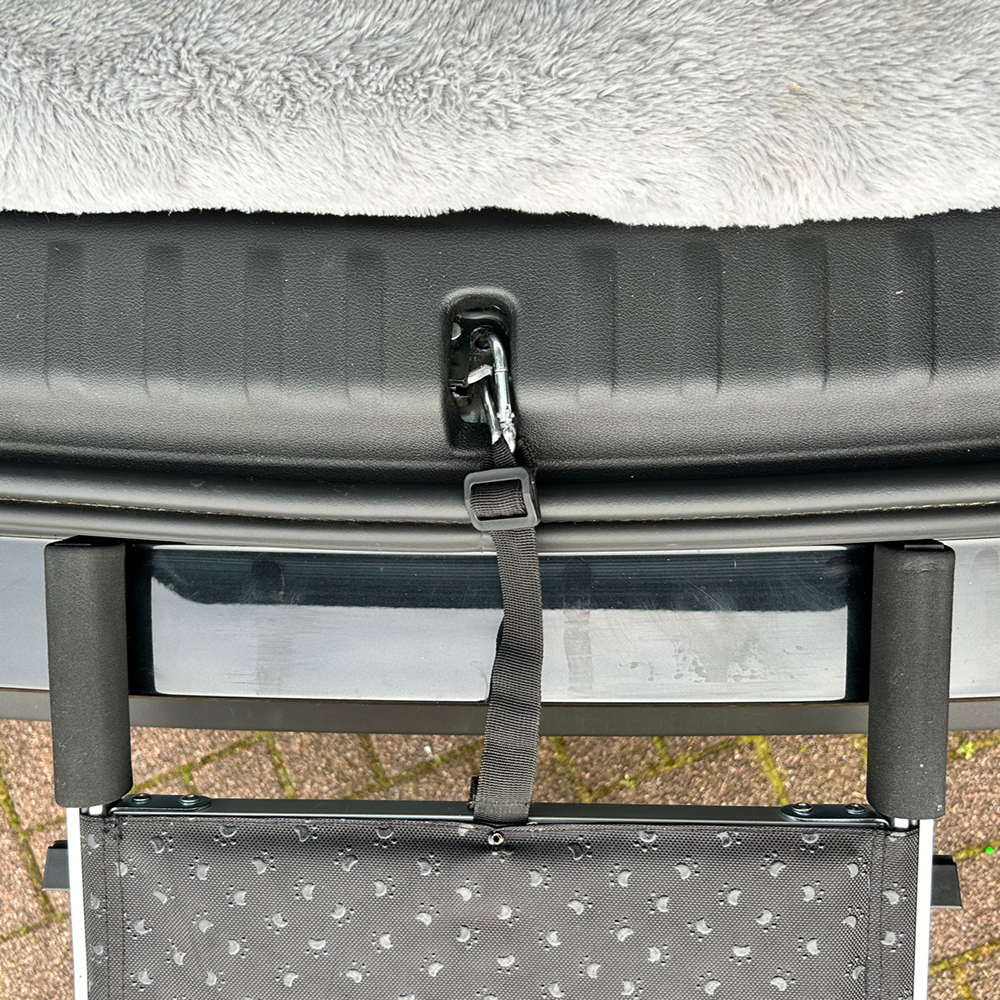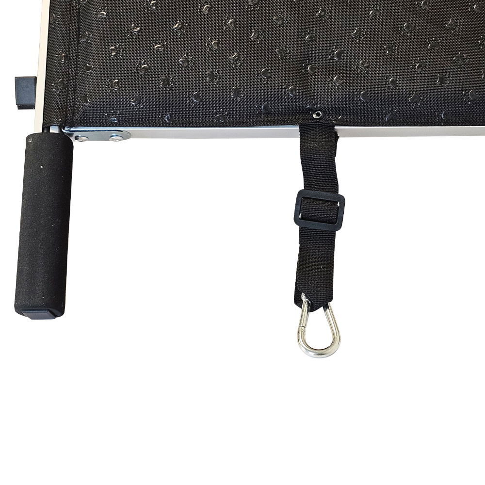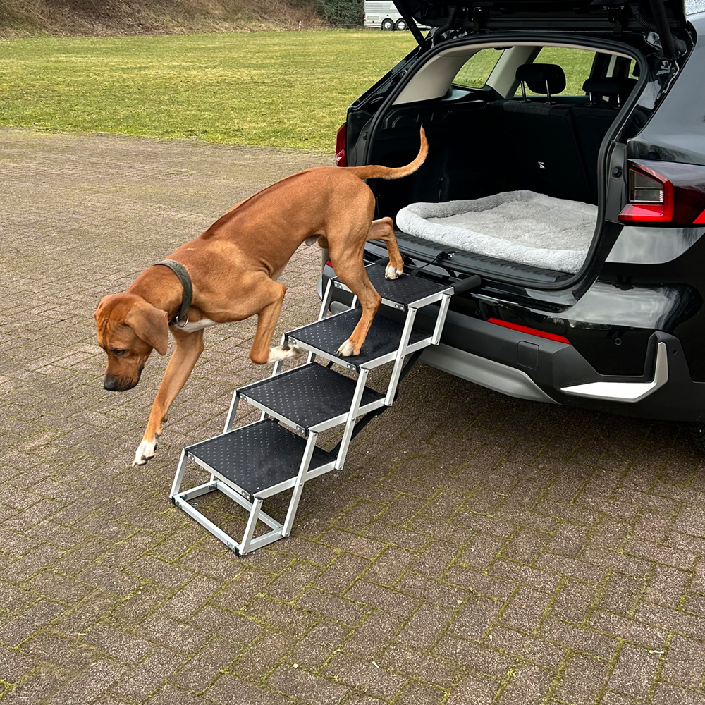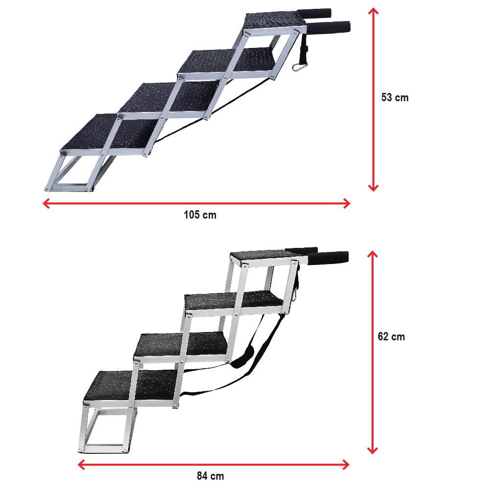 Με 4 σκαλοπάτια και ρύθμιση ύψους μεταξύ 53 και 62 cm, προσφέρει ευελιξία και άνεση. Κατασκευασμένο από στιβαρό αλουμίνιο, πλαστικό και ξύλινη ενίσχυση, εξασφαλίζει σταθερότητα και ανθεκτικότητα. Το αντιολισθητικό πέλμα και το αντιολισθητικό λαστιχένιο σκαλοπάτι εγγυώνται ασφαλές κράτημα, με άνετη λαβή μεταφοράς. Κατάλληλη για σκύλους βάρους έως 75 κιλών.